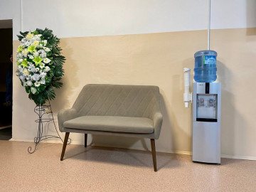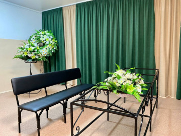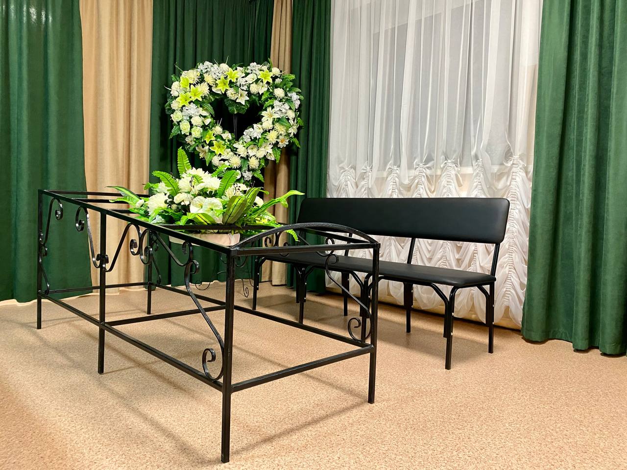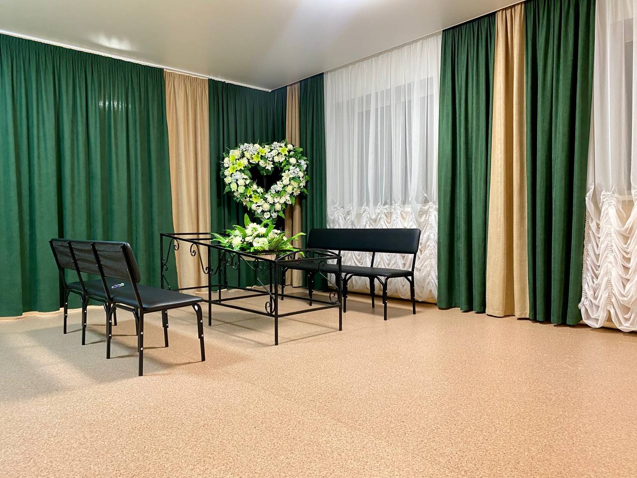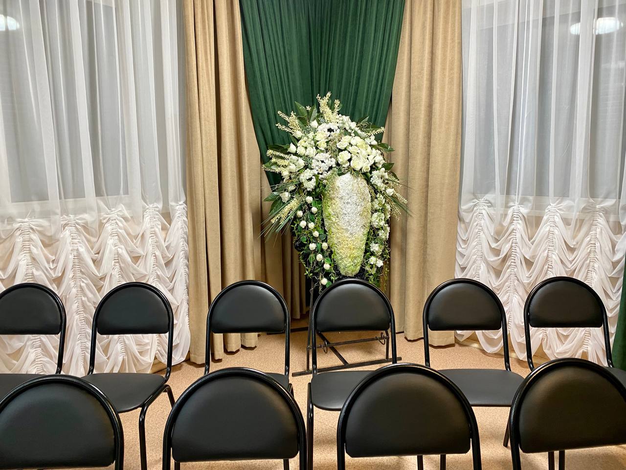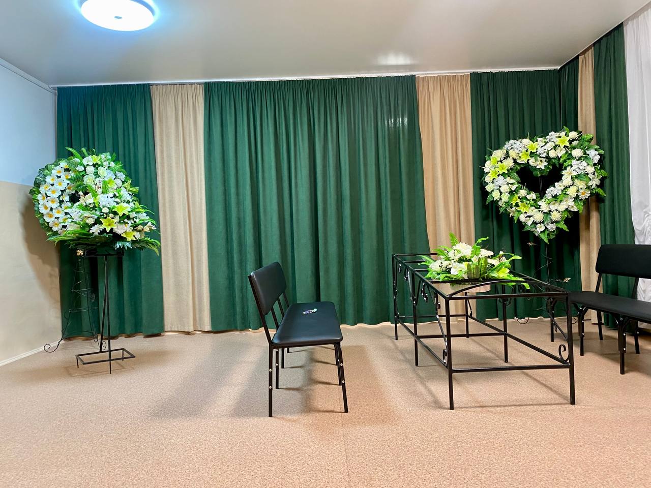 Для проведения траурной церемонии здесь предусмотрено все необходимое: постамент для гроба, 27 посадочных мест, вазы для живых цветов, подставка для венков и портретов, два подсвечника, подставка для флагов, а также стол и тумбочка для ритуальных принадлежностей.